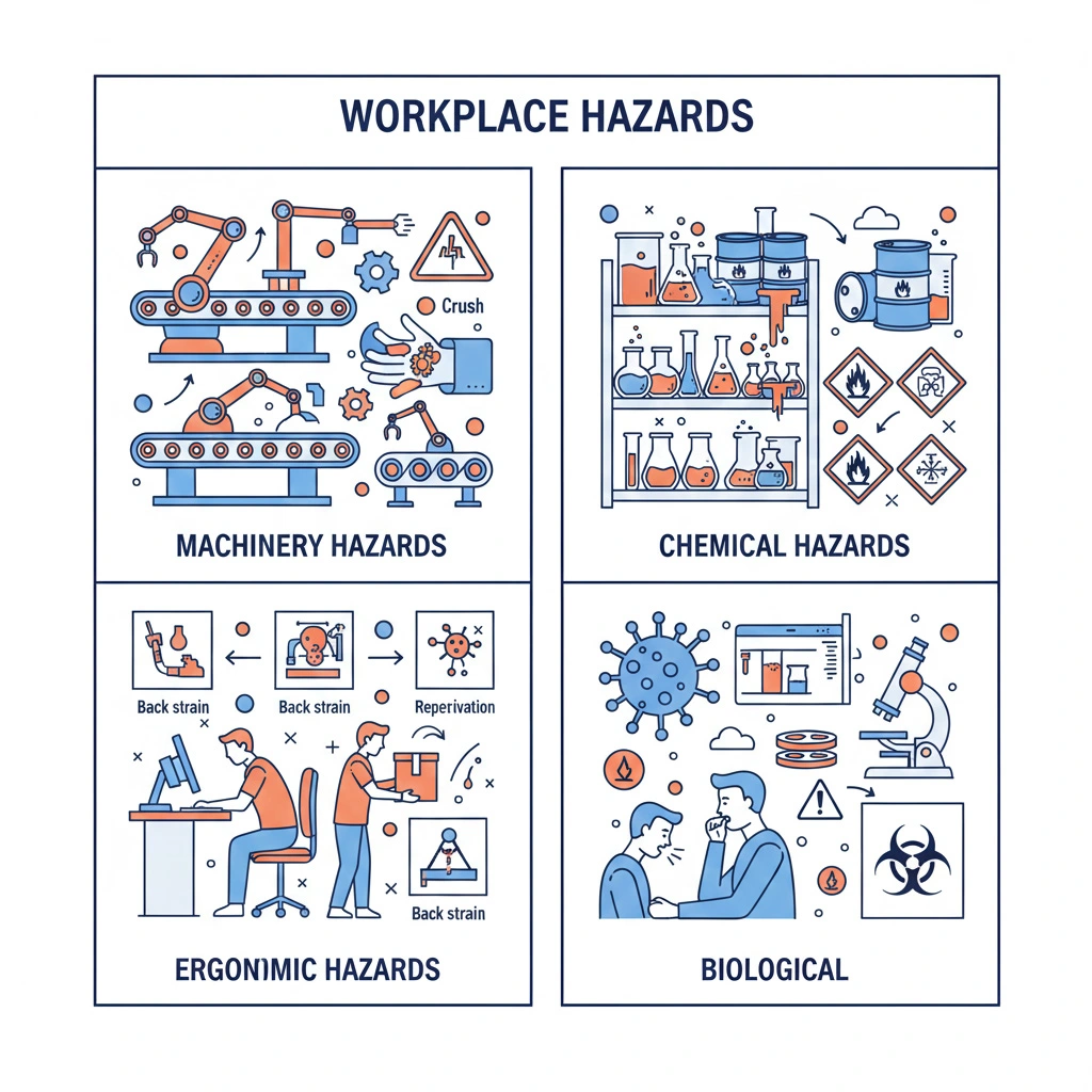 • Physical hazards: Machinery with moving parts, slippery surfaces, excessive noise, extreme temperatures