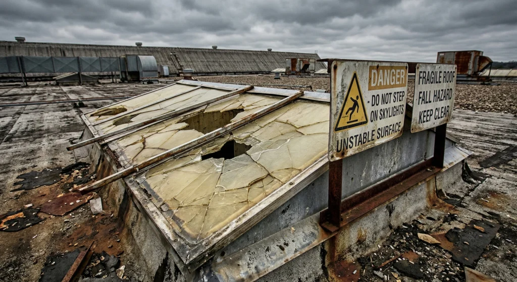 Real-world example: A maintenance worker steps onto what appears to be a solid industrial roof to inspect HVAC equipment. One panel is a skylight covered in grime and dirt. He steps on it. Falls straight through.Â